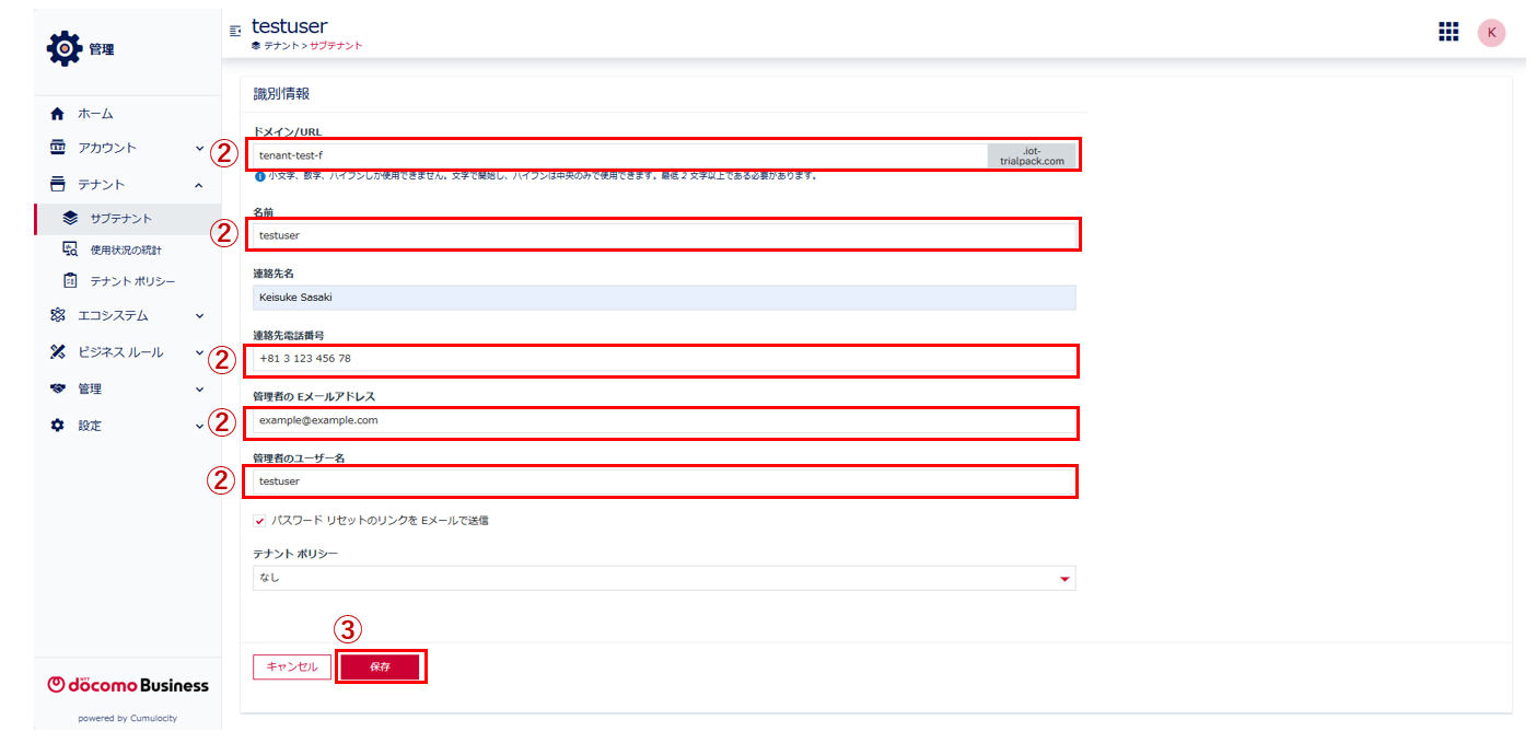 必須事項(ドメイン/URL、名前、連絡先電話番号、管理者のEメールアドレス、管理者のユーザー名)を入力します。
