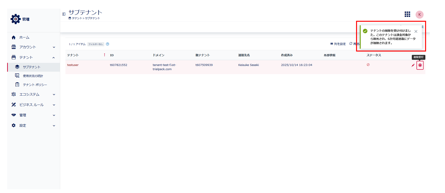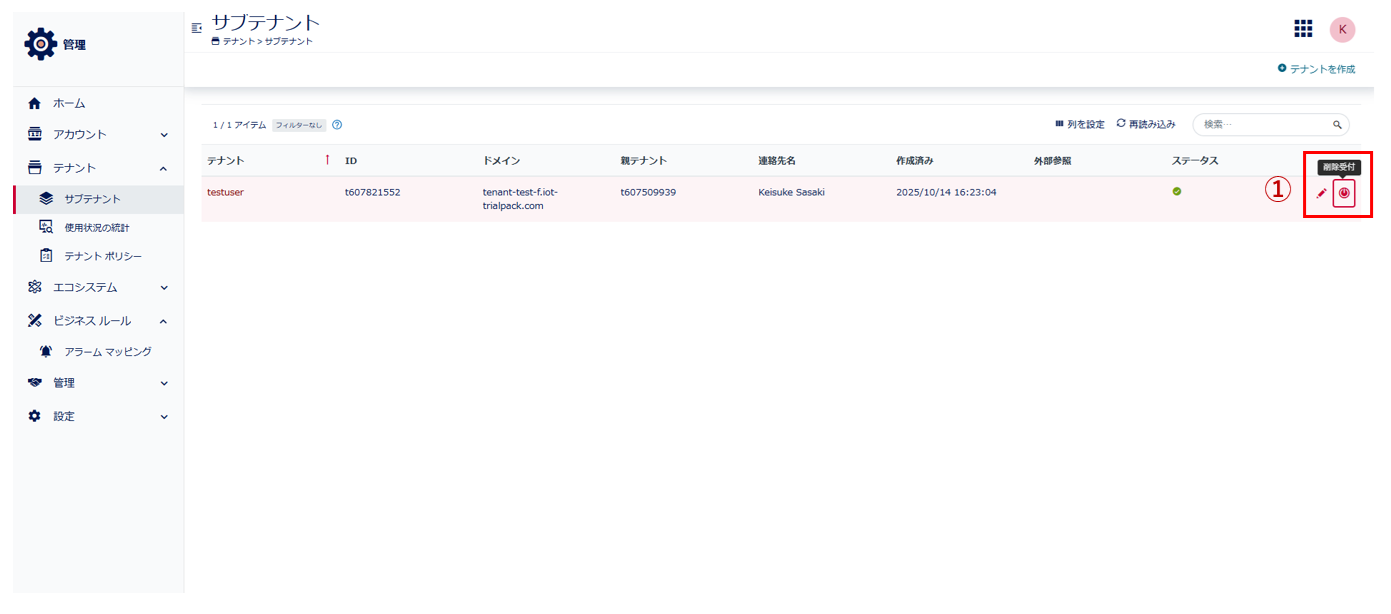 それぞれのサブテナントの右側にあるメニューアイコンをクリックして、削除受付をクリックします。