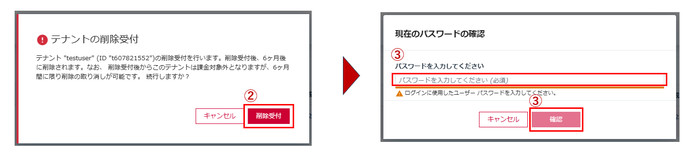3. 親テナント管理者のパスワードを入力し、「確認」を押下すると、該当サブテナントの削除受付が実施されます。削除受付後、該当サブテナントは課金対象から除外され、実際の削除処理は、6か月経過後にバッチ処理によって実行されます。 ※削除受付後から6ヶ月間に限り削除受付の取り下げが可能です。