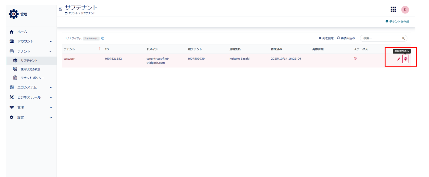 削除受付を取り消したいサブテナントの右側にあるメニューアイコンをクリックして、削除取り消しをクリックします。