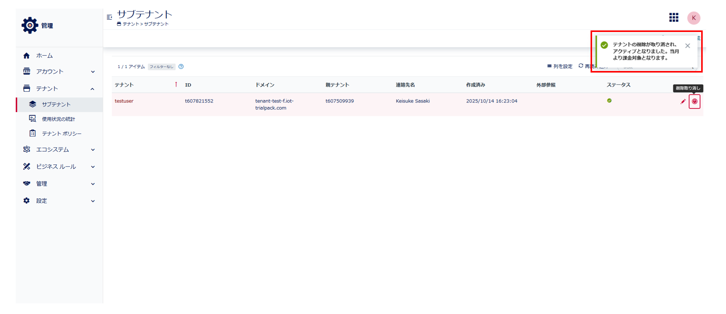2. 「削除取り消し」を押下すると、該当のサブテナントが再アクティブ化され削除受付が取り消された旨のポップアップが表示されます。 ※アクティブ化すると当月より課金対象となります。