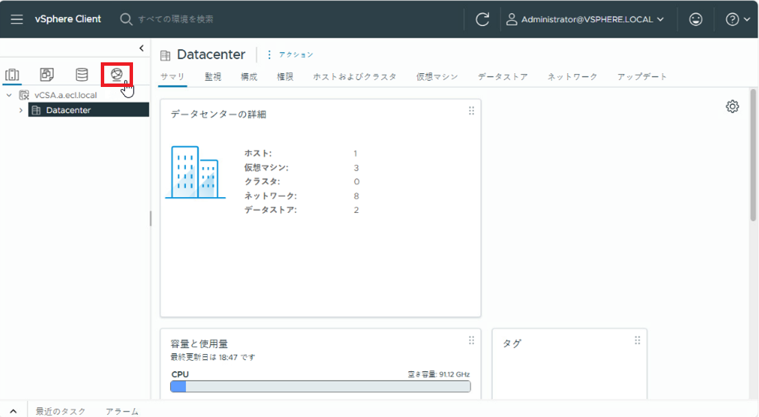 - Webブラウザーのタブを切り替え、vSphere Client画面に戻り、メニューから「管理」を選択します。