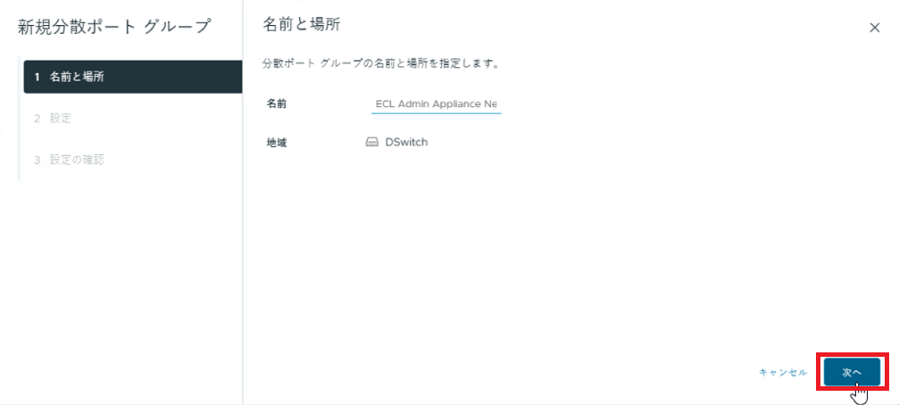 - 「1 名前と場所」画面が表示されるので、名前の項目に「ECL Admin Appliance Network」と入力し、「次へ」をクリックします。