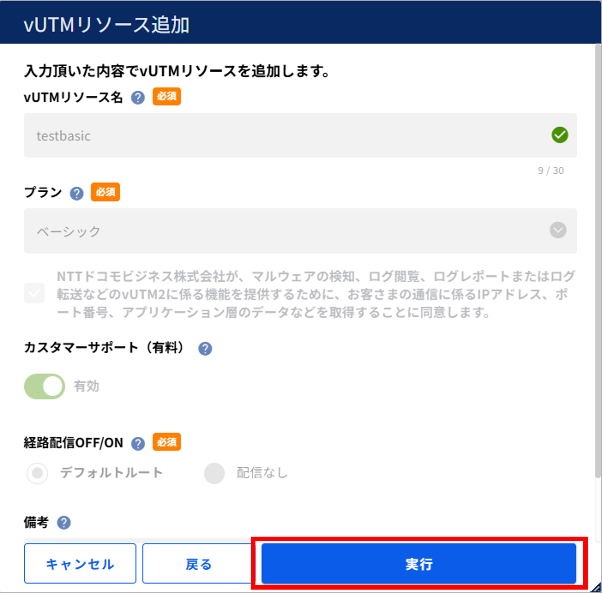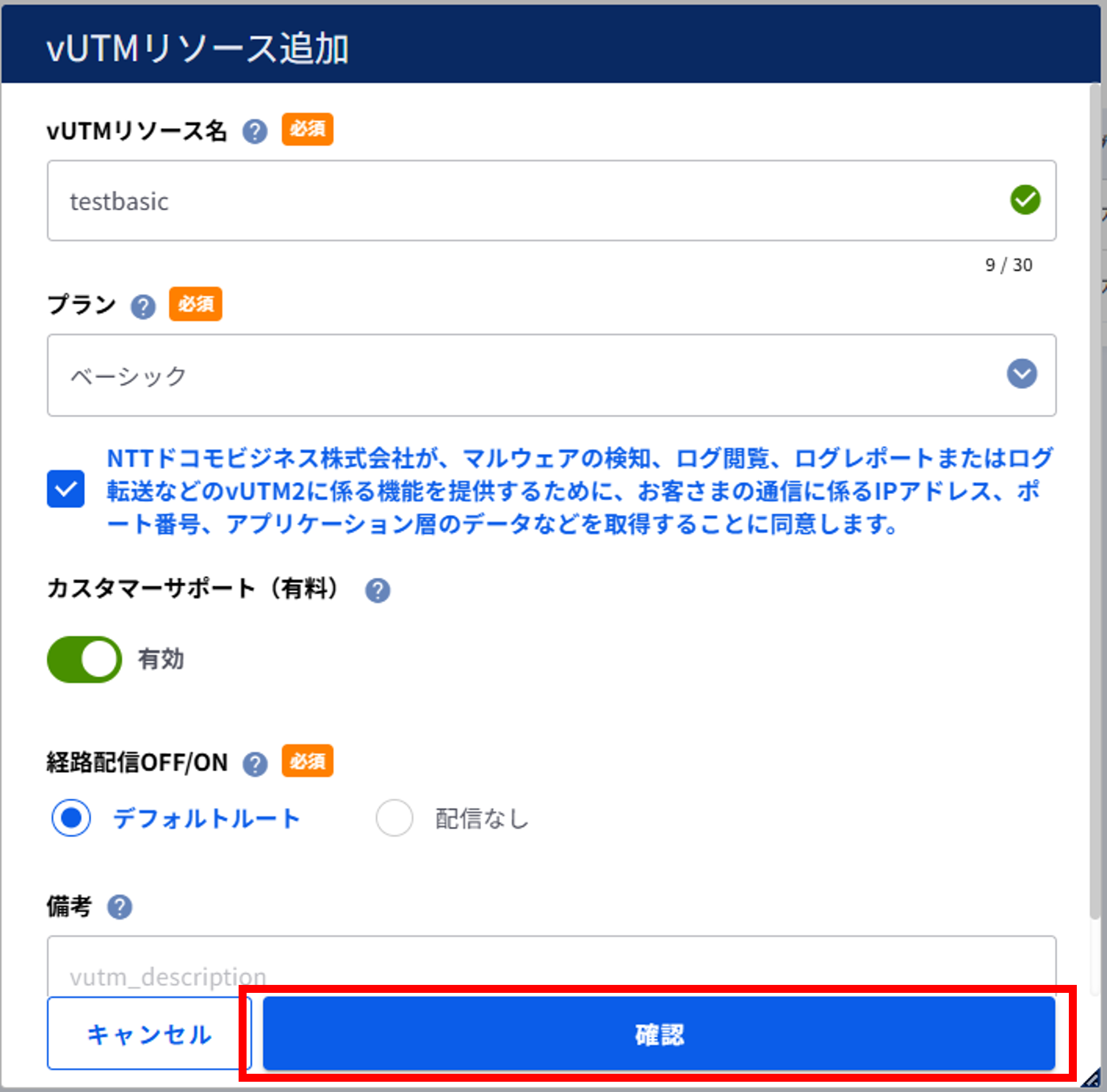 「vUTMリソース追加」画面で必要な情報を入力します。