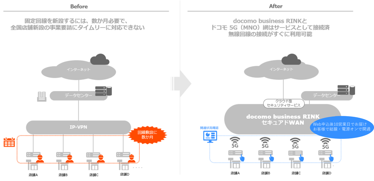 ドコモ回線は工事不要・最短10営業日で開通するため、スピーディーな事業展開にもご活用いただけます。